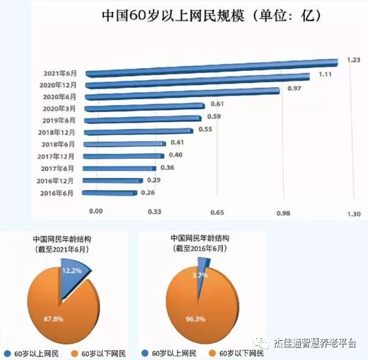 中國(guó)互聯(lián)網(wǎng)絡(luò)信息中心發(fā)布的第48次《中國(guó)互聯(lián)網(wǎng)絡(luò)發(fā)展?fàn)顩r統(tǒng)計(jì)報(bào)告》顯示,截至2021年6月,中國(guó)網(wǎng)民規(guī)模達(dá)10.11億,其中60歲以上網(wǎng)民占比達(dá)12.2%,約1.23億人。而艾媒研究院發(fā)布的《2021年中老年群體觸網(wǎng)行為研究報(bào)告》顯示,51%的中老年日均上網(wǎng)時(shí)長(zhǎng)超過(guò)4小時(shí)。